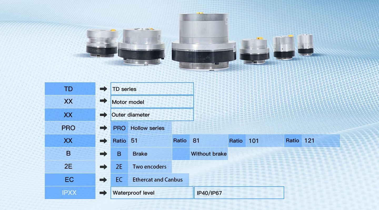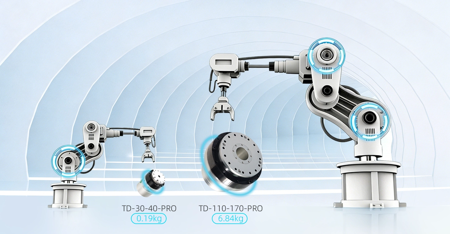 The TD Series Robot Joint Actuator is a compact and lightweight integrated robotic joint actuator featuring an ultra-thin harmonic drive reducer, FOC servo controller, high-efficiency brushless torque motor, integrated brake, and high-precision multi-turn absolute encoder within a single highly integrated module. It delivers high torque density, precise motion control, and reliable performance for advanced robotic applications such as humanoid robots, quadruped robots, collaborative robots, and intelligent automation equipment.