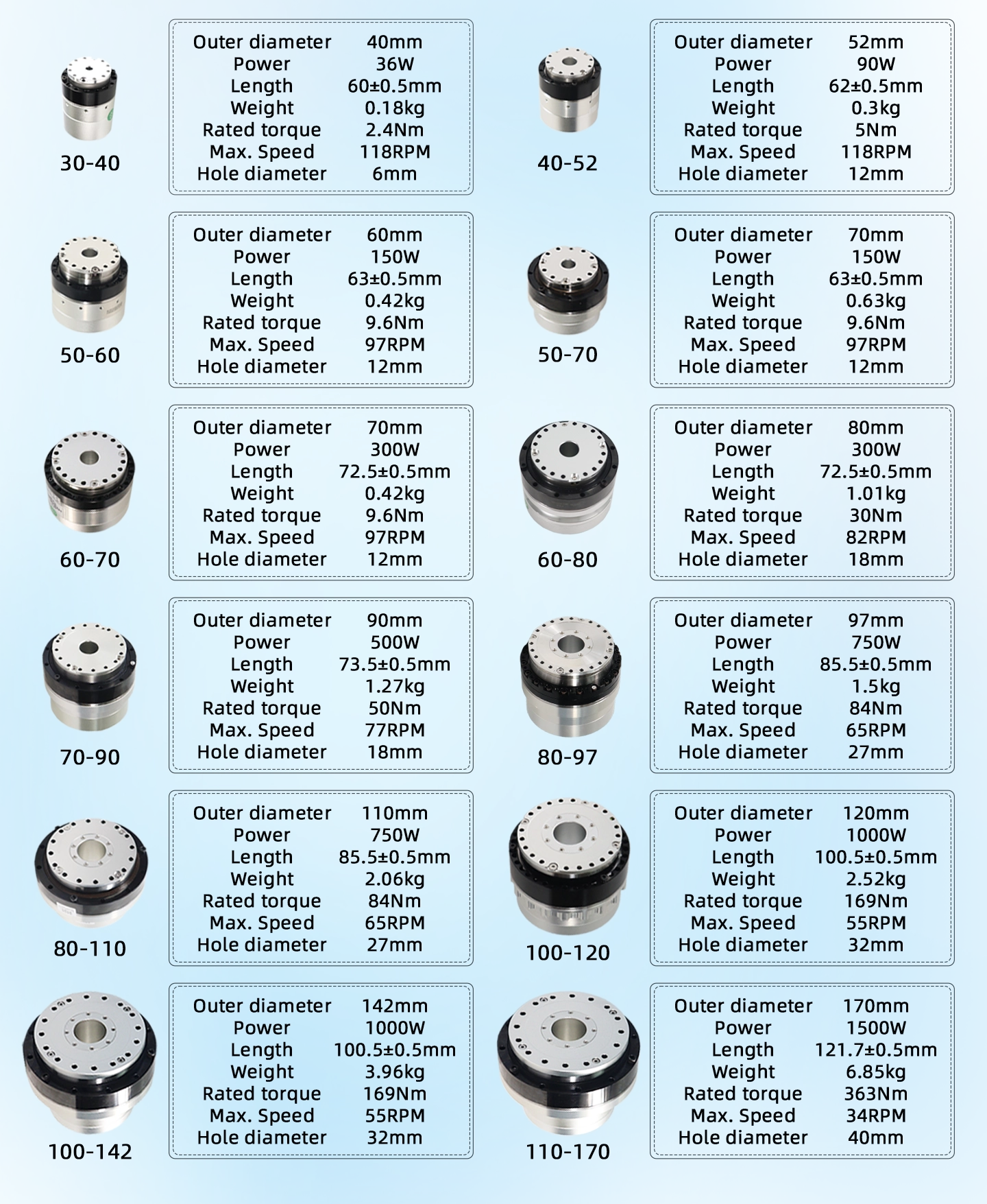 | Rated torque at 2000rpm/ (reduction ratio) | 32/42/50/50 | 32/42/50/50 | 32/42/50/50 | 32/42/50/50 | 48/78/84/84/84 | 48/78/84/84/84 |
